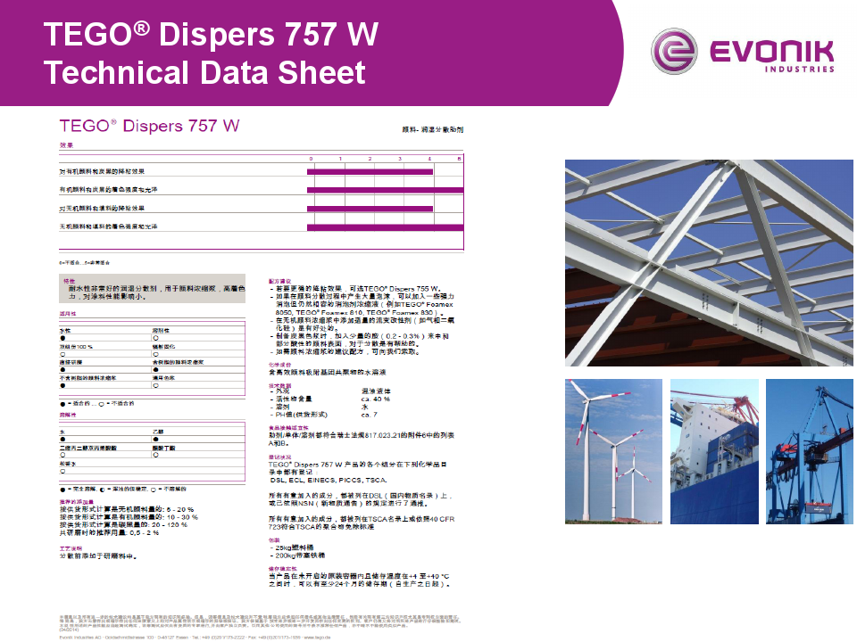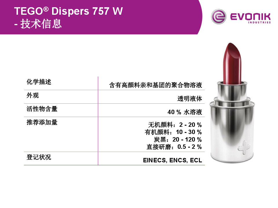 01. > > > TEGO 分散劑 性能 < < < > > > TEGO 757 低的吸水性 < < 03. > > > TEGO 757 的耐鹽霧性能 < < < 04. > > > TEGO 757 節(jié)約成本 < < < 05. > > > TEGO 757 優(yōu)異的相容性 < < < 06. > > > TEGO 757 水性高性能涂料首選 < < < 07. > > > TEGO 757 技術(shù)信息 < < < 08. > > > TEGO 757 有機(jī)顏料參考配方 < < < 09. > > > TEGO 757 無(wú)機(jī)顏料和炭黑參考配方 < < < 10. > > > TEGO 757 產(chǎn)品說(shuō)明書 < < < TEGO 757分散劑 索樣熱線18688841669張先生 佛山三升貿(mào)易 TEGO 740W 分散劑 產(chǎn)品鏈接 高性價(jià)比型 TEGO 760W 分散劑 產(chǎn)品鏈接 碳黑降粘型 TEGO 752W 分散劑 產(chǎn)品鏈接 啞光和透明氧化鐵防沉性優(yōu)異用于耐用性涂料色漿的分散劑