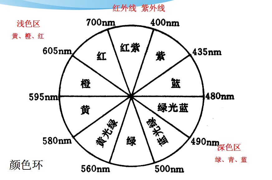 上圖中顏色環(huán)周圍所注的波長標(biāo)度并無物理意義,但從圖中可看出沿著直徑方向,每塊扇形的對頂處,都有另一塊扇形,它們互為補色。例如藍色(435~480nm的扇形)的補色是黃色(580~595nm),即藍光和黃光混合得到的是白光。若某一物質(zhì)的吸收波長小于400nm或大于760nm則該物質(zhì)在紫外光及紅外光部分有吸收,物體呈無色。