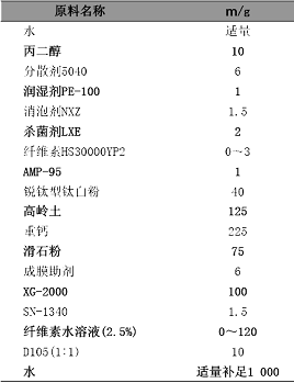依次向容器中加入水、丙二醇、分散劑、潤(rùn)濕劑、消泡劑和纖維素,將纖維素分散至無(wú)粉團(tuán),加入pH調(diào)節(jié)劑,然后加入各種粉料,將分散機(jī)調(diào)至高速開始分散,半小時(shí)后調(diào)低轉(zhuǎn)速加入成膜助劑、乳液和消泡劑,然后用增稠劑增稠。纖維素以兩種方式添加到體系中:一是在分散階段加入;二是配置成2.5%的水溶液(膏體)在調(diào)漆階段加入。2.5%纖維素水溶液配置方法:將纖維素加入水中分散至無(wú)粉團(tuán),然后加入適量的pH調(diào)節(jié)劑調(diào)節(jié)pH值,攪拌使其完全溶解最終成膏狀,待用。表1為基礎(chǔ)配方。