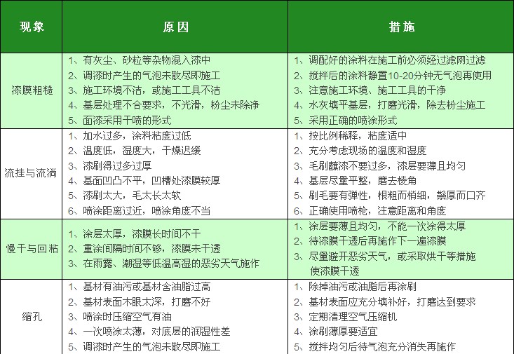 三升水潤(rùn)水性木器漆性能優(yōu)異,但是如果在涂裝、儲(chǔ)存等過(guò)程中不當(dāng)操作,有可能會(huì)引起一些問(wèn)題,具體包括:漆膜粗糙、流掛與流淌、慢干與回粘、縮孔、氣泡、龜裂、黃變、橘皮、咬底等常見(jiàn)漆病。以下對(duì)常見(jiàn)的漆病做介紹 :