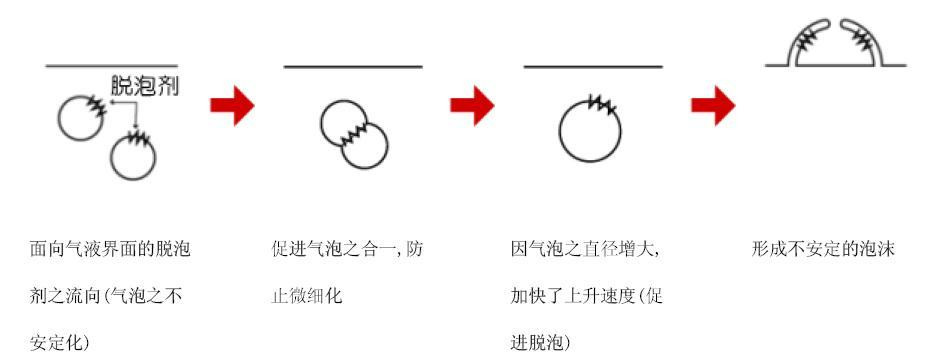 破泡:相對于泡沫(泡沫聚合體),從空氣側(cè)侵入泡中,將泡合一破壞。即破泡劑吸附于氣泡后,因表面張力之作用侵入氣泡膜中。隨后,表面張力因破泡劑在泡膜表面的擴(kuò)張,使泡膜變薄, 進(jìn)而破壞泡膜。