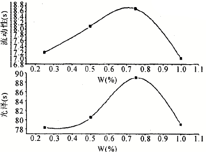 以前,對涂料流平劑的研究基本上處在憑實踐經(jīng)驗摸索的水平上,隨著涂料流變性測量技術(shù)的發(fā)展,人們開始了對流平劑改善涂料流平性機理的研究如:討論了流變添加劑控制涂料流動性,產(chǎn)生流變性結(jié)構(gòu)的基本原理,添加劑的類型及如何測定流變性結(jié)構(gòu)的方法。研究了熱固性丙烯酸粉末涂料的流變性,作者采用國產(chǎn)擠出式毛細管流變儀,考察了丙烯酸樹脂分子量、粘度,流平劑等因素對丙烯酸粘度的影響。討論了醋酸鋅、苯甲酸衍生物及硅砂對聚丙烯酸酯熔體粘度(η) 的影響。結(jié)果表明聚丙烯酸酯熔體是非牛頓流體,其流動活化能隨著剪切速率的增大而減小。加入醋酸鋅后,η有明顯的提高;而同時加入等摩爾的醋酸鋅和苯甲酸衍生物后,η保持不變,加入硅砂后,η有明顯提高。流變儀和擠出式毛細管流變儀,對影響甲基丙烯酸縮水甘油酯( GMA) 類丙烯酸粉末涂料流變性能的諸多因素,如基體樹脂的分子量、流平劑用量、固化劑用量等進行了較多的研究,其中流平劑的用量對涂料的影響見圖2 。
