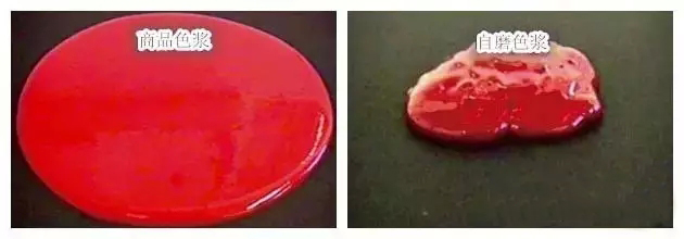 色漿流動性的影響因素很多,如色含量、分散顆粒的大小、樹脂含量的高低等。自磨色漿生產(chǎn)多使用三輥機,要求上機的物料必須是高黏度才能有效生產(chǎn);該工藝生產(chǎn)過程溶劑損失大,必須全天候的的人工看守,生產(chǎn)效率低、批次間穩(wěn)定性較差,在儲存和使用過程中,黏度大產(chǎn)品不易精確稱量、在容器中黏附器壁物料多、污染損耗量大、使用時容易引起涂膜的流平性差。電腦調(diào)色是現(xiàn)代化涂料調(diào)色的重要工具,如果黏度過大,容易引起色漿添加不準確,使得整個調(diào)色系統(tǒng)崩潰。商品化的色漿生產(chǎn)企業(yè)對于色漿配方、原材料品質(zhì)和生產(chǎn)工藝控制都有著嚴格的規(guī)定,完全可以避免自磨色漿因為助劑和配方選擇不當、原材料品質(zhì)的不穩(wěn)定、加工工藝控制不嚴等原因?qū)е碌纳珴{流動性和流平性差的問題(見圖3和圖4),可滿足手動調(diào)色、機器調(diào)色及泵輸送,與客戶自磨色漿相比較,使用更方便。