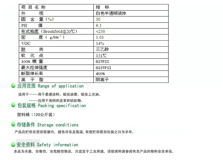 - 為供應(yīng)打印油墨及皮革面漆類客戶,三升推出水性聚氨酯樹脂PU-3339,此款樹脂表面絲滑,中軟,耐失光;耐水優(yōu)異,沸水澆淋,不發(fā)白,不起泡;斷裂伸長率為300-450%;穩(wěn)定性好,耐磨性能優(yōu)異