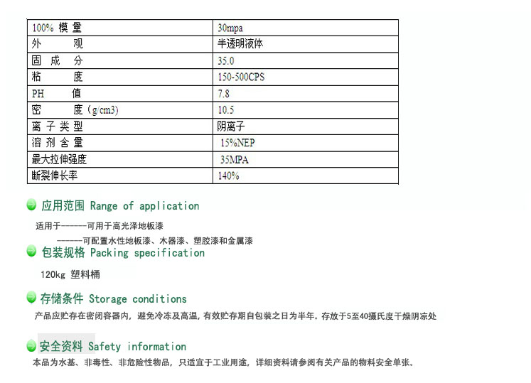 - 為供應打印油墨及皮革面漆類客戶,三升推出水性聚氨酯樹脂PU-3339,此款樹脂表面絲滑,中軟,耐失光;耐水優(yōu)異,沸水澆淋,不發(fā)白,不起泡;斷裂伸長率為300-450%;穩(wěn)定性好,耐磨性能優(yōu)異